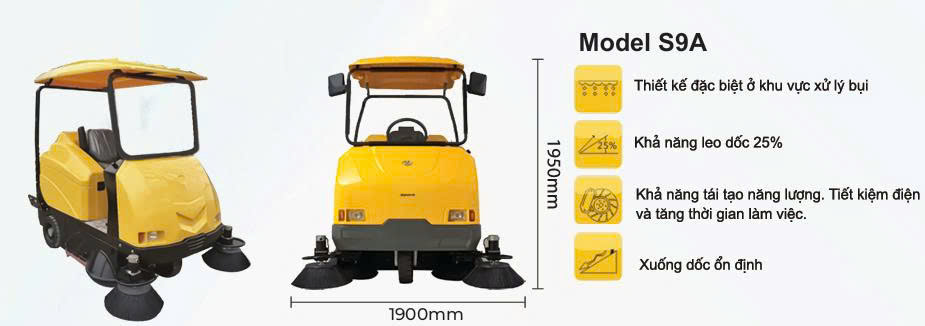 - S9A có khả năng làm sạch liên tục với hệ thống chổi quét và hút bụi mạnh mẽ, giúp loại bỏ nhanh chóng các loại rác thải và bụi bẩn. Xe có thể làm sạch trên nhiều loại bề mặt khác nhau mà không gặp phải vấn đề về hiệu suất.